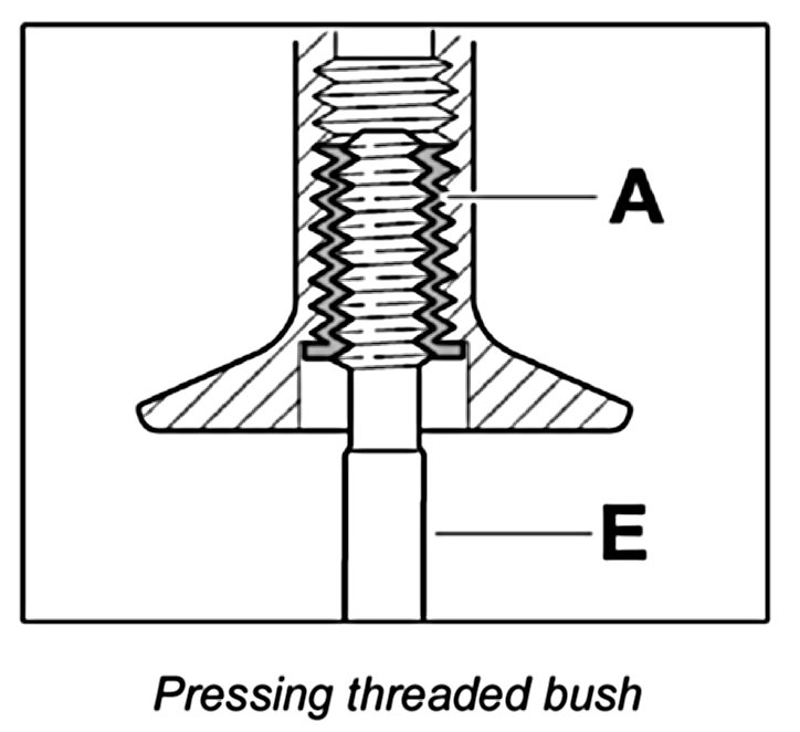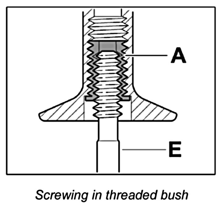 Screw threaded bush A in fully (note bush length classification) using the screw-in tool E.