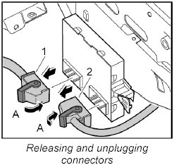 4. Release both electrical connectors -1, 2- -A- and unplug them from the control unit.