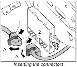 1. Press both electrical connectors -1, 2- into control unit and lock them until they are felt to engage.