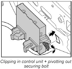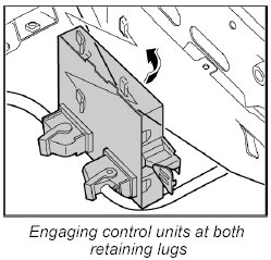 2. Engage control unit in support for wiring harness with both retaining lugs.