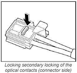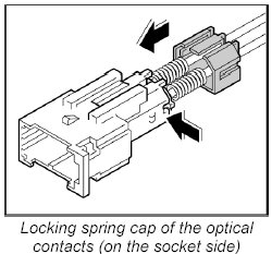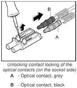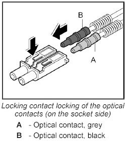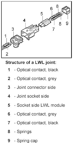 The LWL is delivered with affixed plastic contacts. These contacts are latched in the connector housing in the case of repairs. Grey and black contacts with identical mechanical dimensions are used.