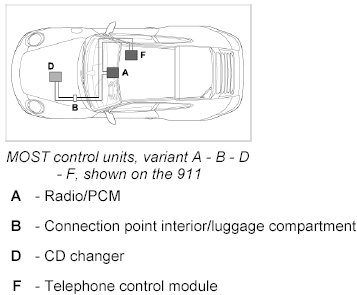 The graphic clarifies the cabling of the individual MOST control units which vary according to their equipment.