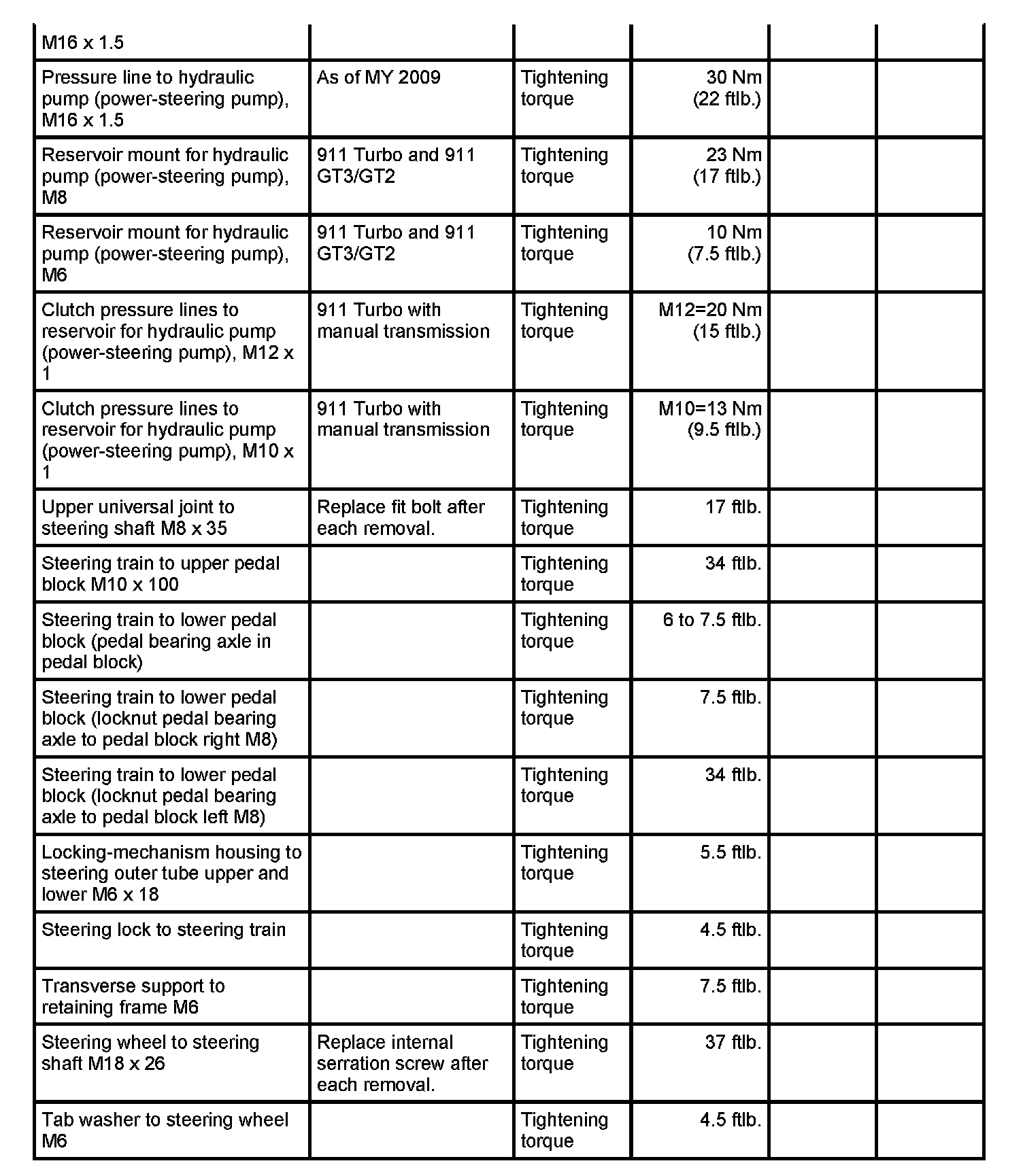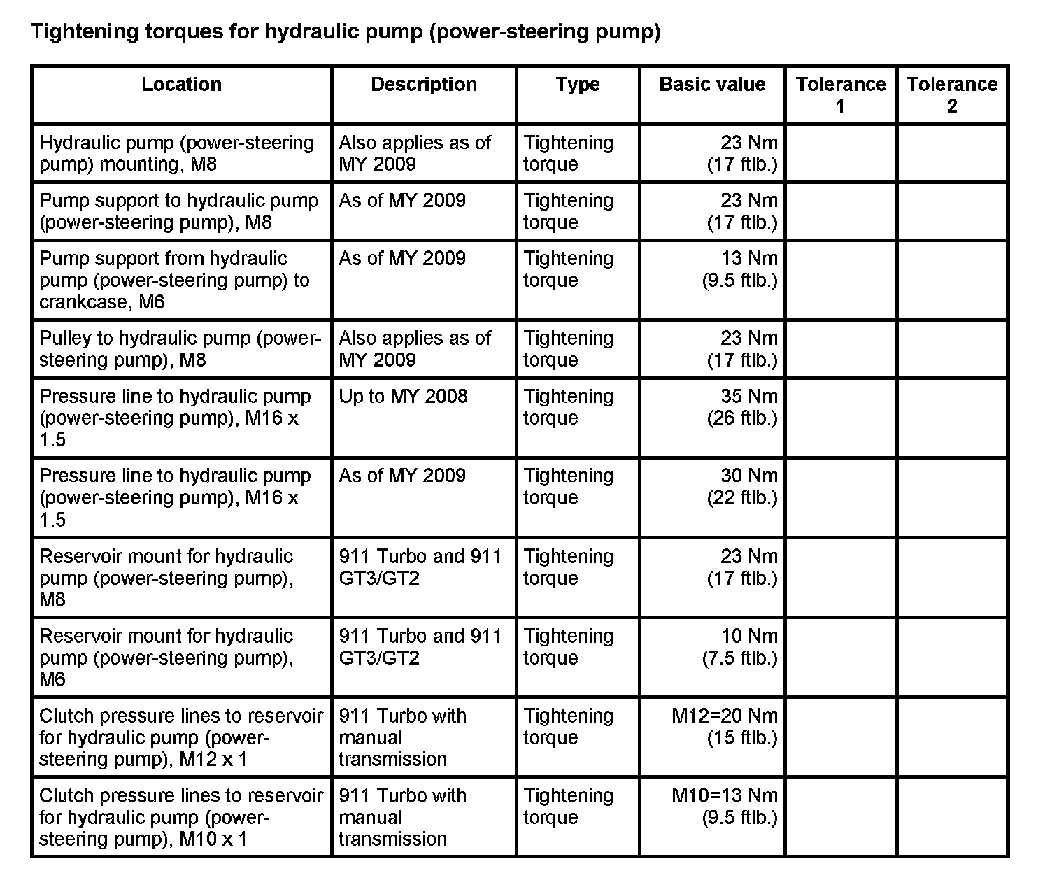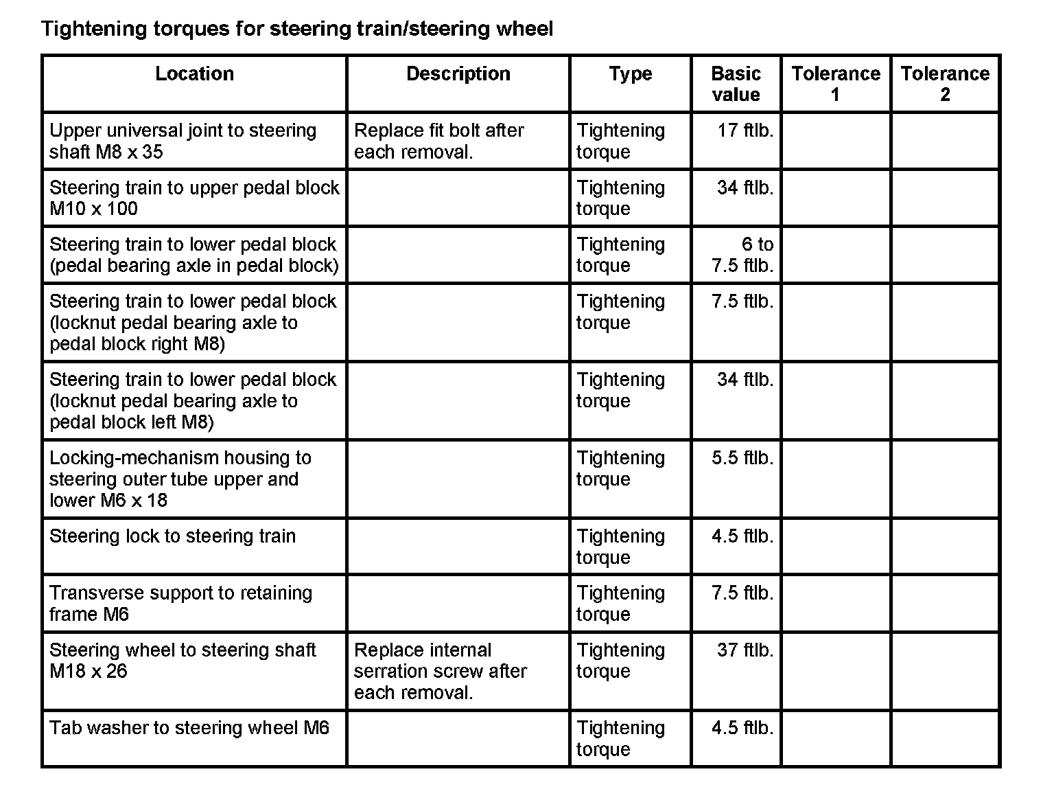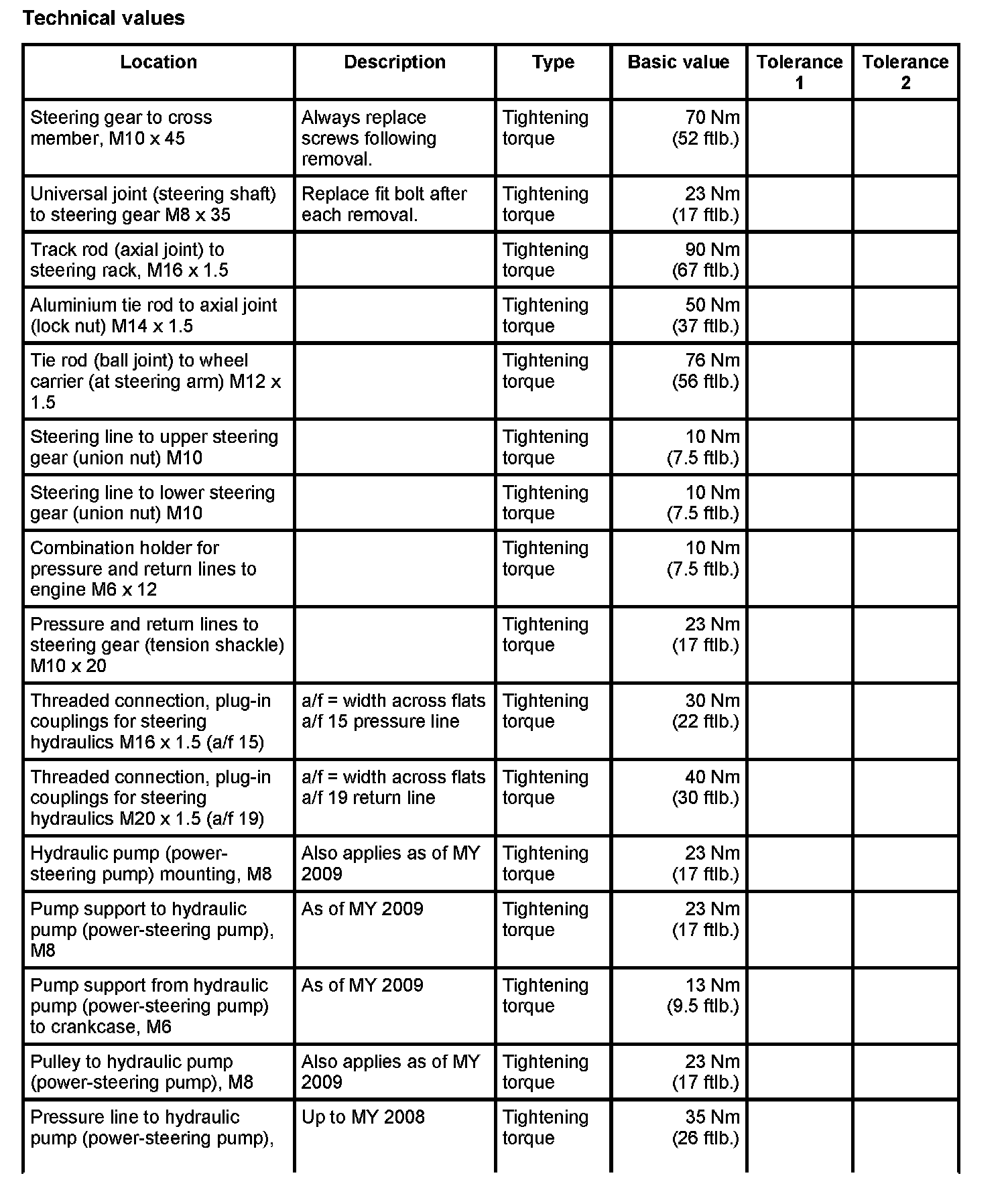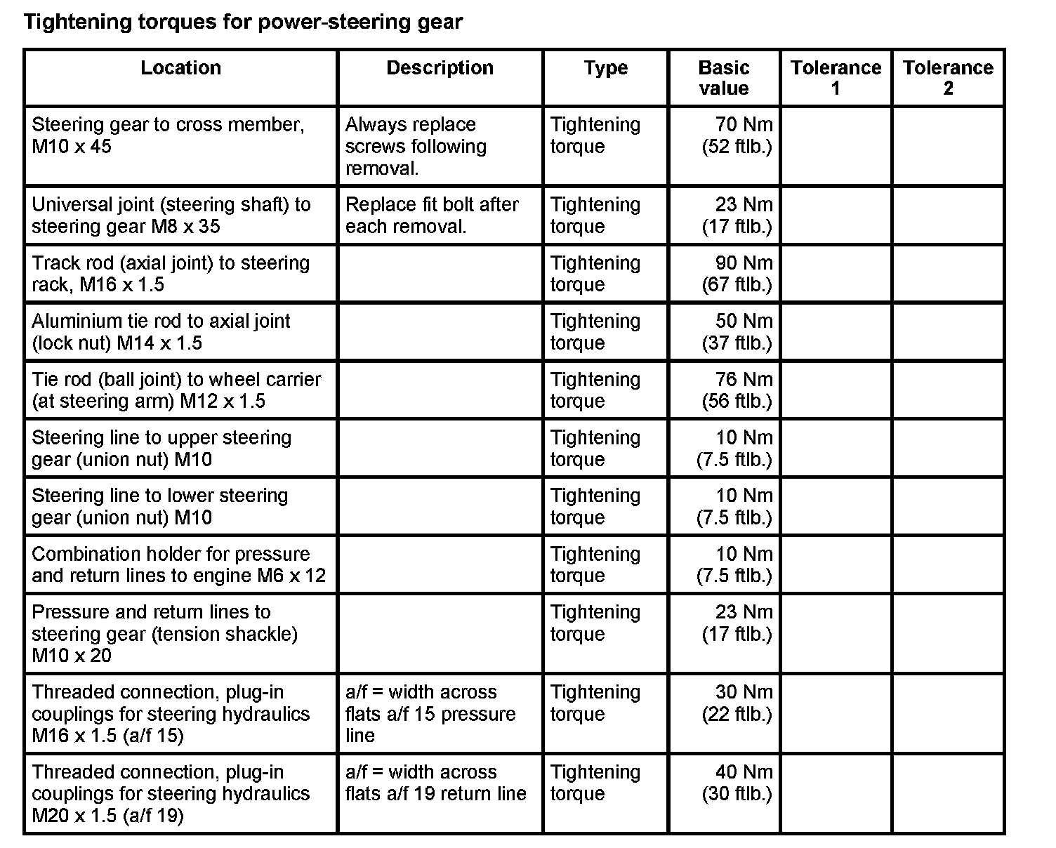 Tightening torques for