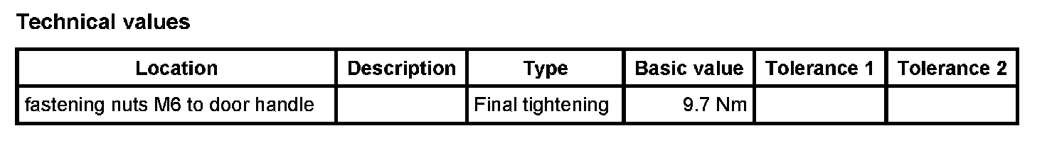 2. Position the lower part of the door handle -2- under the handle and screw down with fastening nuts -1-. Tightening torque Final tightening: 9.7 Nm (7 ftlb.)