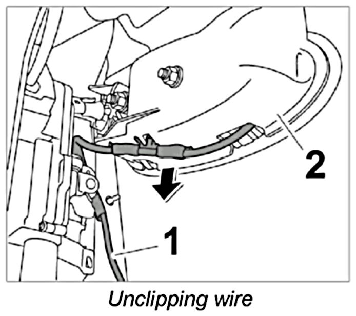 1. Unclip electric wire for microswitch -1- from the bottom part of door handle -2-.