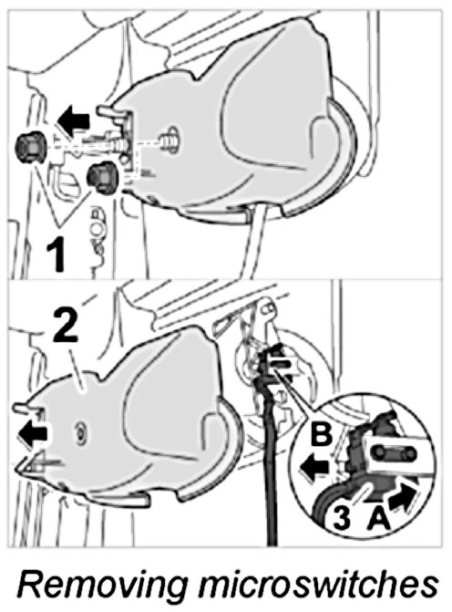 3. Gently loosen the locking tab -arrow A- and remove the microswitch -3- -arrow B-.