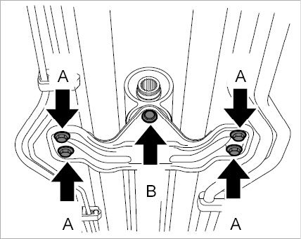 8. Loosen fastening nuts -B- for front bracket -A- and unscrew the studs -C-.