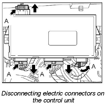 2. Release electric connectors -A- on the control unit and disconnect them.