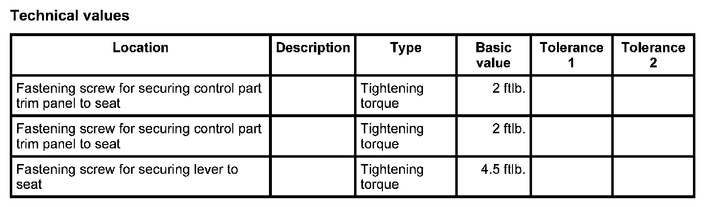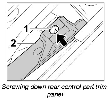 3. Screw down rear control part trim panel 2 with the fastening screws 1. Tightening torque: 2 ftlb.