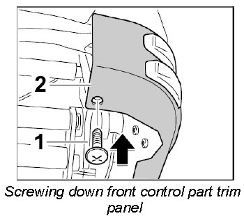 4. Screw down front control part trim panel 2 with the fastening screws 1. Tightening torque: 2 ftlb.