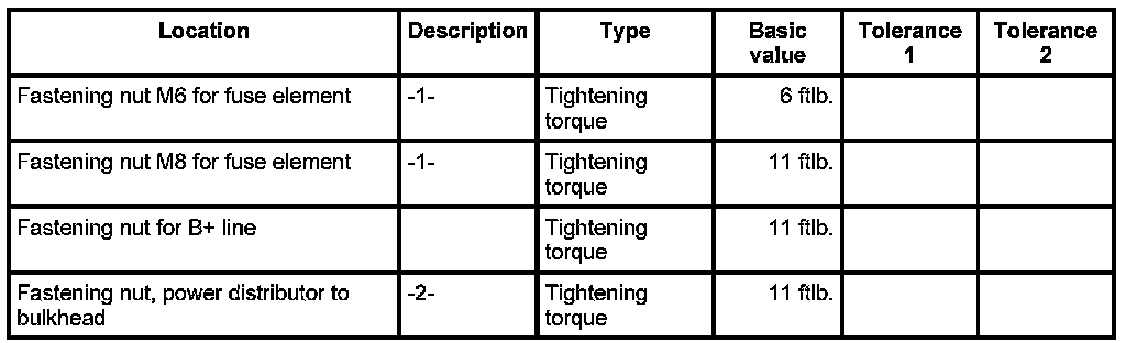 1. Position the fuse elements -3- in the power distributor in accordance with the wiring diagram and position the marked connection leads in turn, fit the washer -2- and tighten with the fastening nuts -1-. - Tightening torque: 6 ftlb. - Tightening torque: 11 ftlb.