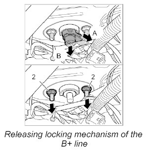 10. Unscrew fastening nut for the B+ line and remove the power distributor.