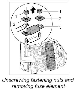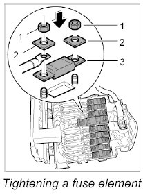 9. Unscrew the fastening nuts -1- , remove the washer -2- and take out the fuse element -3-.