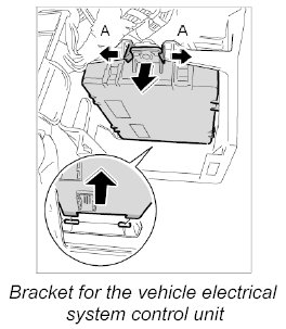 1. Pull apart the locking tabs -A- for the vehicle electrical system control unit, pull the control unit forward and down with connectors still attached then pull it out of its holder at the rear.