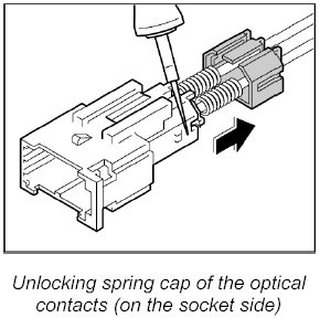 3. Position the press-out and unlocking tools for flat-type and round plug connectors of all sizes NR.155 for releasing the contact locking mechanism of the optical waveguide module and lift up the locking mechanism.