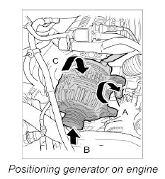 3. Insert the generator into the engine area -C-, then push upwards -B- and lift over the bracket -A-.