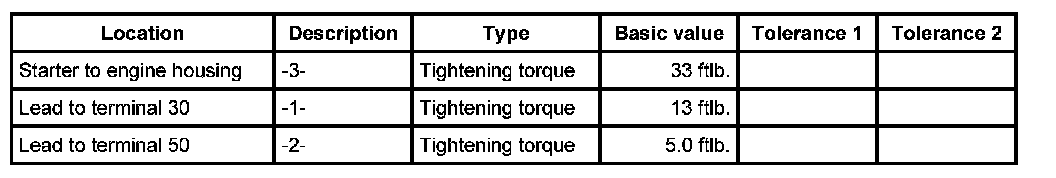 3. Position electrical leads on the starter and tighten with fastening nuts -1, 2-. - Tightening torque: 13 ftlb. - Tightening torque: 5.0 ftlb.
