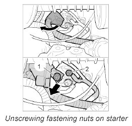 2. Unscrew fastening nuts -1, 2- on the starter, remove the leads and lay them to one side.