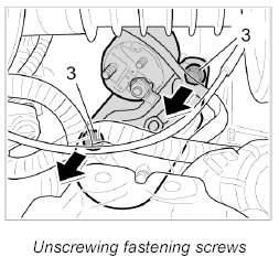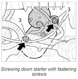 2. Insert fastening screws -3- on starter, screw into the engine housing and tighten - Tightening torque: 33 ftlb.