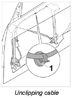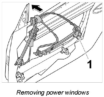 4. Fold power windows -1- together and remove through the door opening -arrow-.