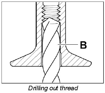 Drill out old thread as far as the base of the thread using a drill bit contained in the M10 or M14 kit B.