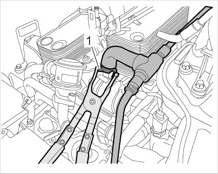 22.2. Open the clamp -1- and remove lines for the turbochargers.