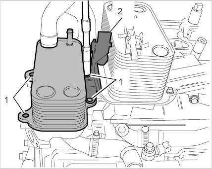 39. Remove the two oil/water heat exchangers. A holder -2- is also secured to the small heat exchanger.