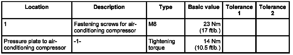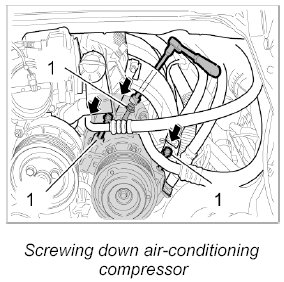 5.1. Fit air-conditioning compressor to engine housing with the rear fastening screws and tighten with the three fastening screws -1-. - M8: 23 Nm (17 ftlb.)