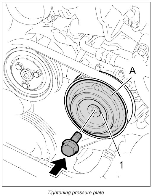 1. Use a commercially available strap wrench to securely hold the pressure plate -A- on the air-conditioning compressor, and undo the fastening screw -1-.