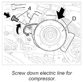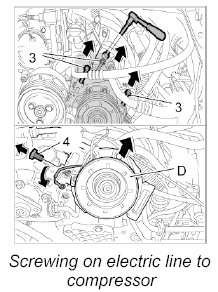 6.2. Remove the air-conditioning compressor and lift upwards, now the fastening screw -4- for the solenoid coil line is accessible.