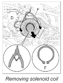 8. Remove Seeger circlip ring -F- for the solenoid coil with the Seeger circlip ring pliers. Remove the solenoid coil from the compressor housing.
