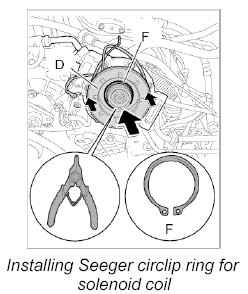 2. Position Seeger circlip ring -F- for solenoid coil -D- and fit using Seeger circlip ring pliers.