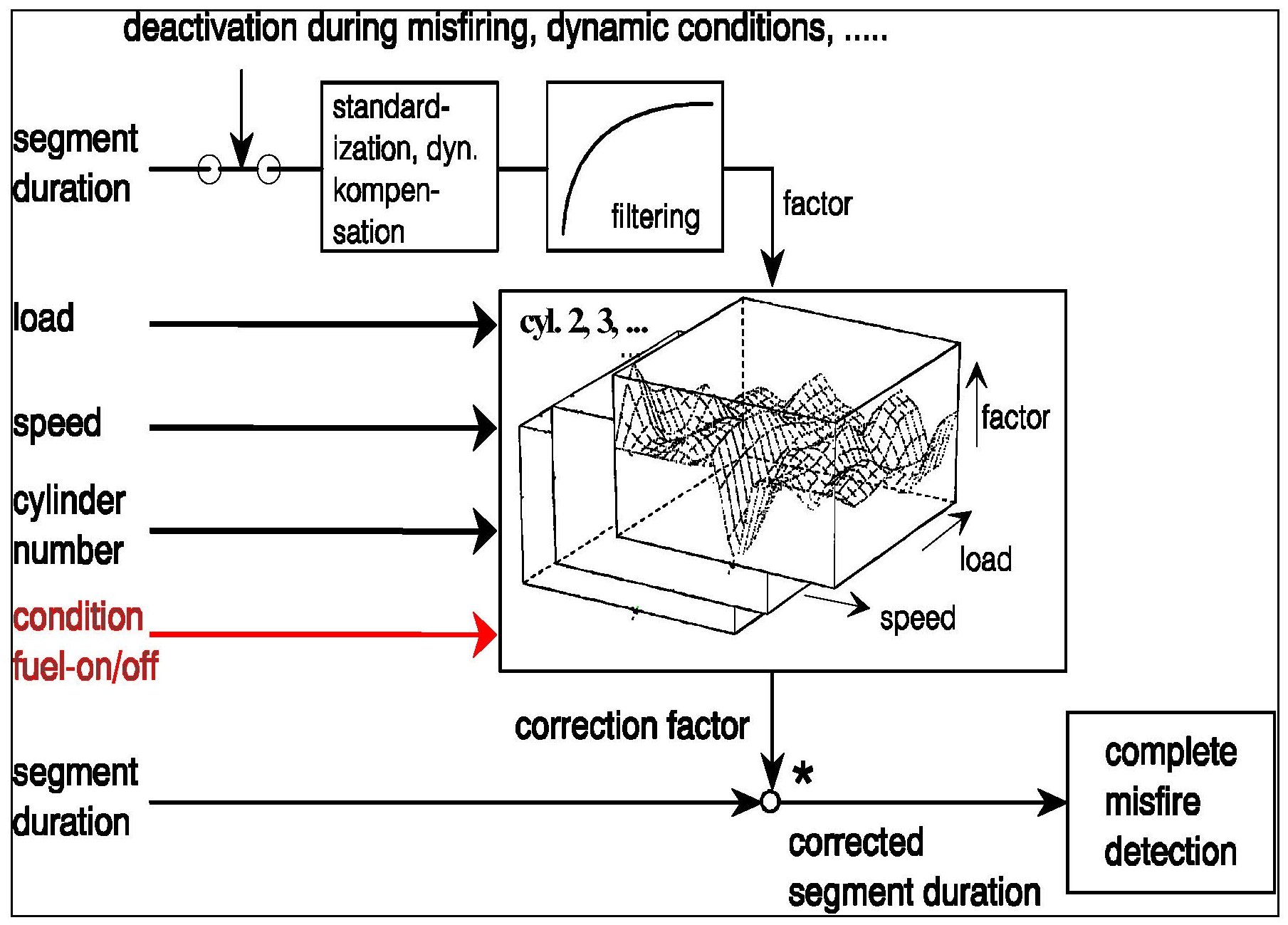 The detection performance is independent of sensor wheel inaccuracies (crankshaft-synchronous segment time fluctuations). However, symmetrical multiple misfires which can also generate crankshaft-synchronous segment time fluctuations cannot be detected. A calculated value is compared to a load and speed dependant threshold. If this threshold is exceeded misfire is detected.