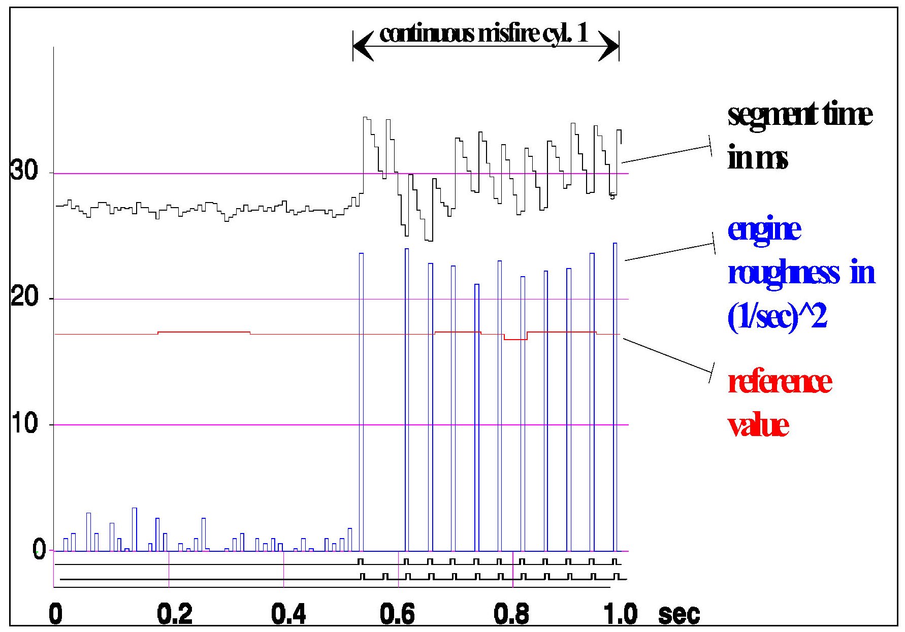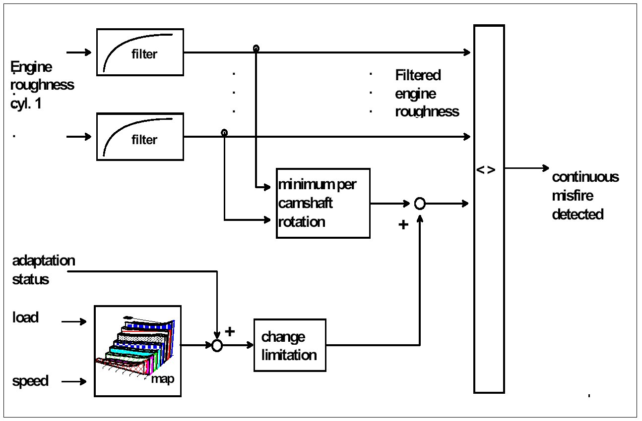 This function allows detection of continuous misfire in one or more cylinders. For this the cylinder-specific engine roughness values are filtered by means of recursive low pass filters and compared to an accompanying threshold / reference value.