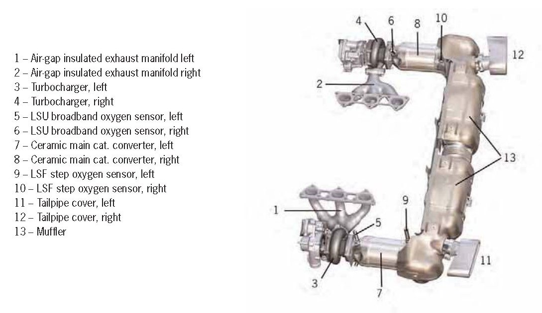 It was possible to further improve the emission values by the use of state-of-the-art catalytic converter technology with one 3-way ceramic main catalytic converter for each cylinder bank and by improved secondary air injection after cold starting (Europe: EU4; USA: LEV II).