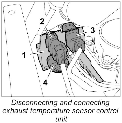 3.5.2. Release exhaust temperature sensor control unit -1- by compressing the retaining lugs -2- and pull it upwards in the direction of the -arrow- , then remove it. Remove exhaust temperature sensor control unit with the lines.