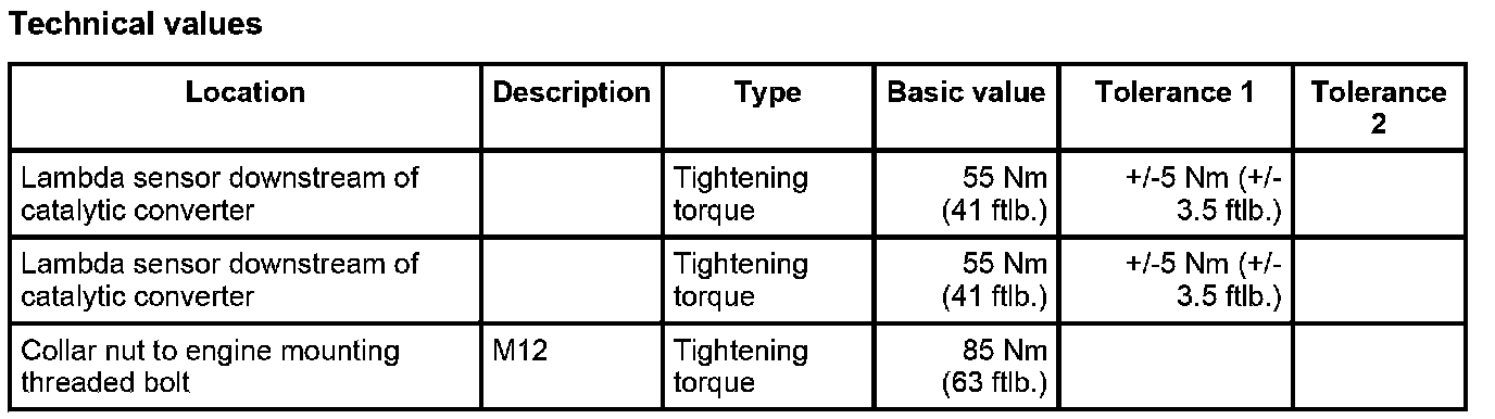 - Tightening torque: 55 Nm (41 ftlb.) ±5 Nm ( ±3.5 ftlb.)
