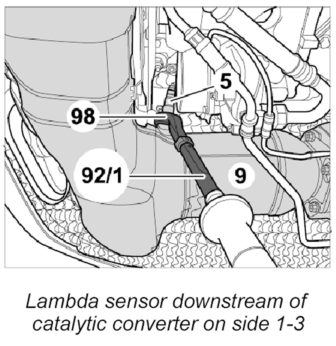 Loosen and unscrew left lambda sensor -5- downstream of catalytic converter -9- using an open ring wrench Nr.98 and torque wrench Nr.92 Pos.1.