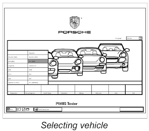 6. Switch on the Porsche PIWIS Tester 9718, select Diagnosis and then highlight the vehicle 911 (997).