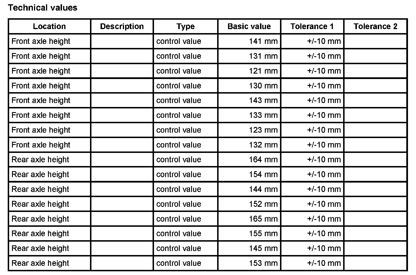 Adjustment values for suspension alignment