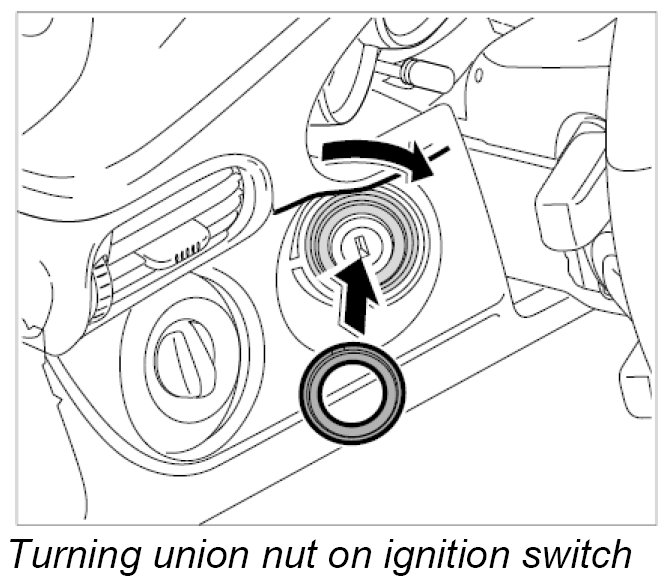 2. Turn union nut using a narrow plastic spatula, for example, or using the special wrench T10152 tool and unscrew the ring from the ignition switch.