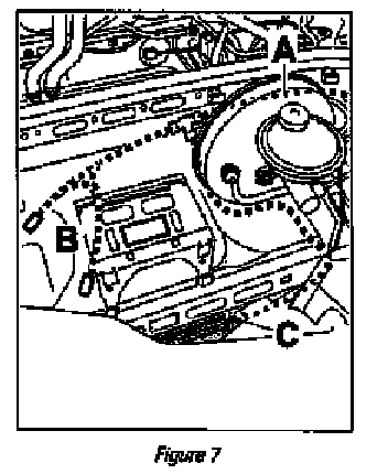 6.4 Route optical waveguide from optical waveguide connection point --> Figure 7-A- along the front panel to the navigation unit installation position --> Figure 7-B- and possibly to the amplifier --> Figure 7-C- or CD autochanger and secure at this position.
