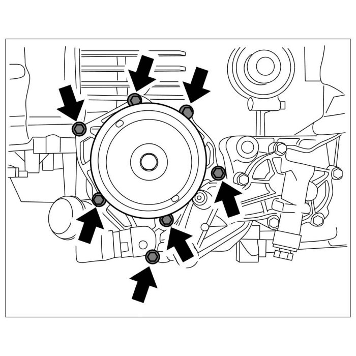43. Remove coolant pump by unscrewing six hexagon-head bolts (M6 x 25, M6 x 30) -Arrows-. Replace metal seal during installation.