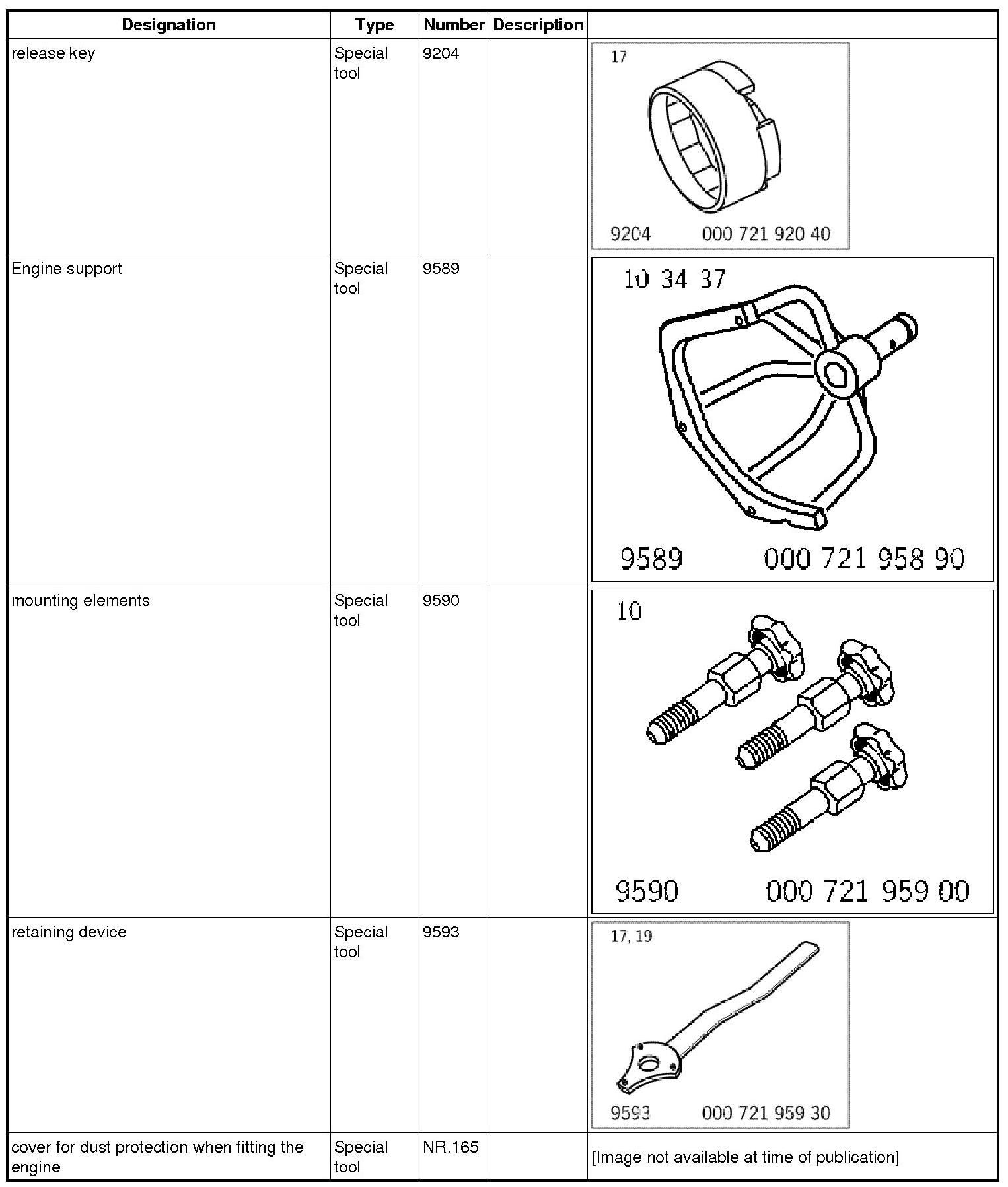 1. Engine support 9589 must be secured to the crankcase using special tool mounting elements 9590. Refit engine with support on the engine assembly support.