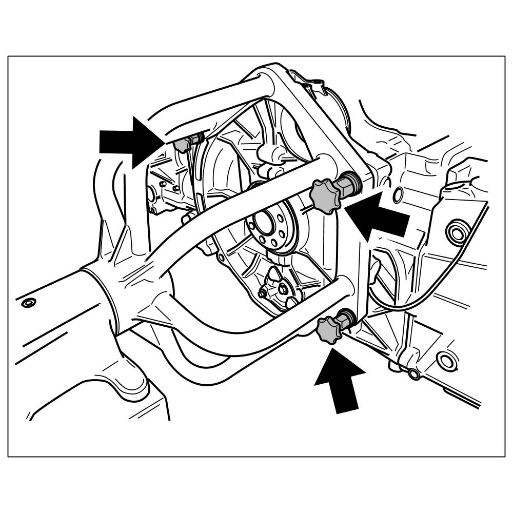 37. Remove engine mounting by unscrewing the three hexagon-head bolts (M10 x 120) and the hexagon-head bolt (M10 x 80). Only loosen the left upper hexagon-head bolt (M10 x 120); the hexagon-head bolt can be unscrewed after the engine mounting has been removed.
