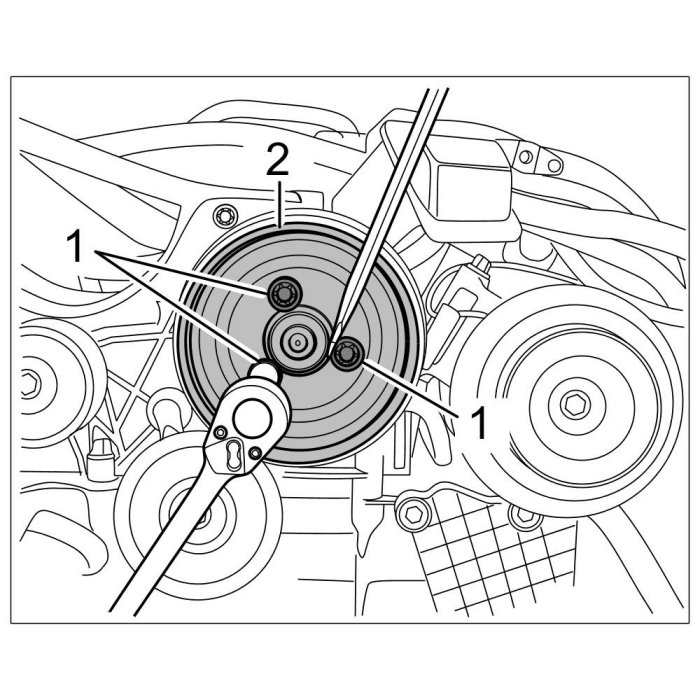 3. Remove pulley -2- of power-steering pump; to do this, counter the pulley -2- as shown using a screwdriver, then remove three Torx screws (M8 x 12) -1-.