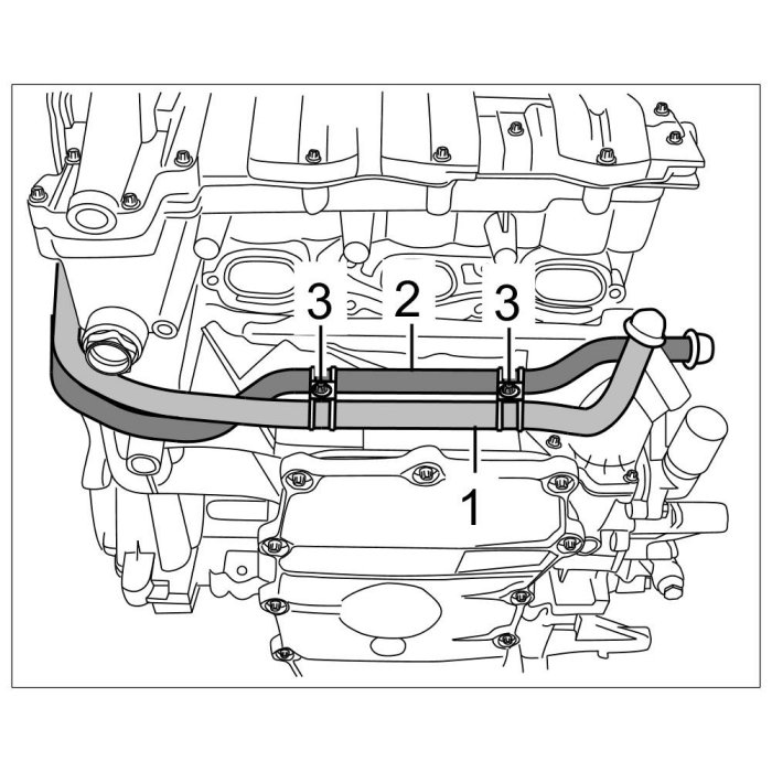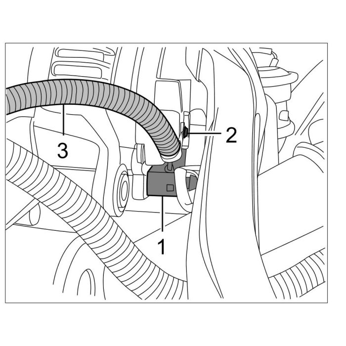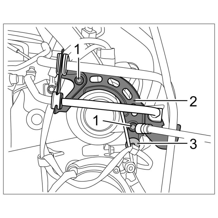 8. Loosen support for servo lines -2- by unclipping the oxygen sensor line from the support -3- and unscrewing two Torx screws (M6 x 12) -1-.