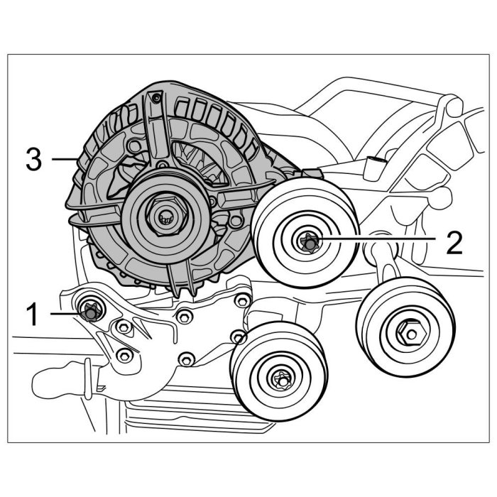 14. Remove generator -3- by unscrewing the Torx screws (M10 x 35) -1- and (M10 x 145) -2-. The deflection roller is removed together with the generator ( -3- ) -> 272219 Removing and installing generator - section on "Removing" Service and Repair.