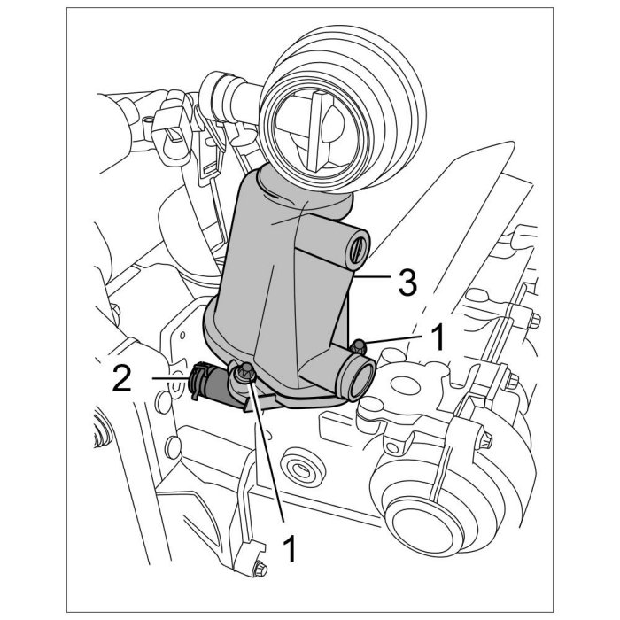 44. Remove thermostat housing. Unscrew four Torx screws (M6 x 20) and remove housing complete with thermostat. Replace seal during installation.