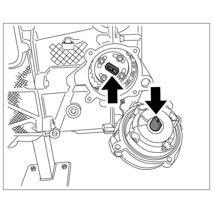 45. Remove tandem pump by unscrewing four Torx screws (micro-self-locking, M6 x 30) -Arrows-. During installation, note the position of the pump drive with respect to the groove on the camshaft sprocket. Both parts must be in line in installation position. Otherwise the pump drive must be rotated. Replace O-ring and screws during installation.